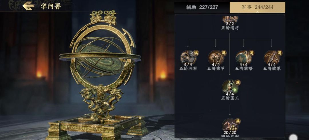 学问署:学问署是研究科技的建筑,目前最高25级。科技分为军事、辅助两大类,能提供不俗的属性加成,所以在建筑升级的时候科技升级也不能落下哦。那科技升级有没有什么讲究?当然有的,在前期因为我们资源有限不可能全部科技点满,我们需要根据自己的实际需求进行有序的研究。比如军事科技,主要包含提升战斗类的属性,可以根据您核心部队是侧重于谋略还是兵刃再进行对应的研究。军事科技包含攻击、防御、血量、克制以及扩充部队上限,其中扩充部队上限优先级通常最高,因为与整体开荒节奏、体力恢复有关。攻防血克能直接影响部队实力,升级也不能落下哦。再看辅助科技,除了常规的资源产出增益外,建造城塞和分城也需要在此研究解锁。可以先按照科技树的顺序去升级建造城塞的科技(城寨作用是比较大的,在前线建造城寨,前线部队可以进入城寨迅速补兵无需返回主城,大大减少了行军来回时间),然后再逐个返回去升级各个科技的等级。而建造分城科技解锁条件相对高一些,根据前置提示升级即可。