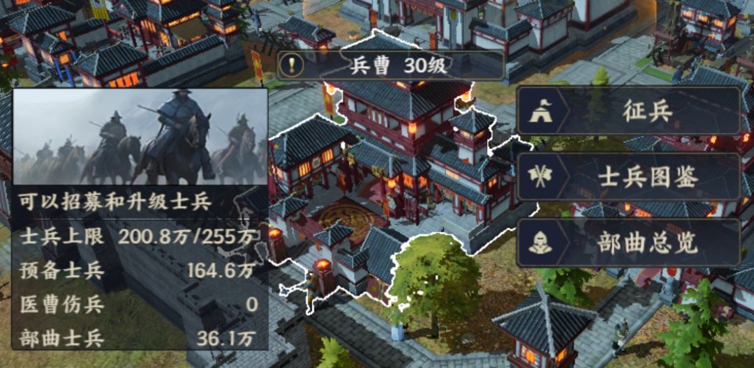 兵曹:招募士兵的建筑,最高30级,提升兵曹等级可提升招募士兵的速度、兵力上限,还可以提升士兵等级,士兵是组成部队的必要条件,会直接影响到部队实力,也是优先升级的建筑之一。