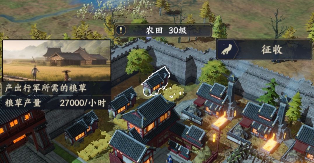 粮草,木材,铁矿是游戏核心资源,主要有城外村庄和城内资源建筑两个主要产出途径,也是优先升级的建筑之一。