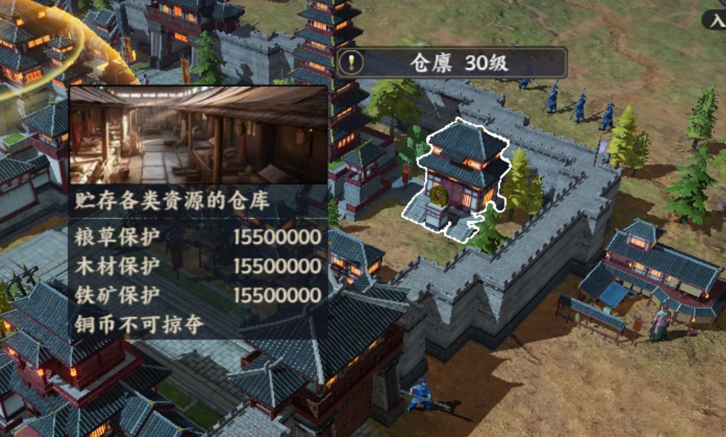 仓廪:城被攻打时可以保护我们的非安全资源,最高30级,提升等级可以提升保护数量上限,和降低被掠夺的比例。可根据所在服务器情况决定,如果服务器比较和平,升级优先级不高,如果服务器掠夺激烈,可对应提高优先级了。