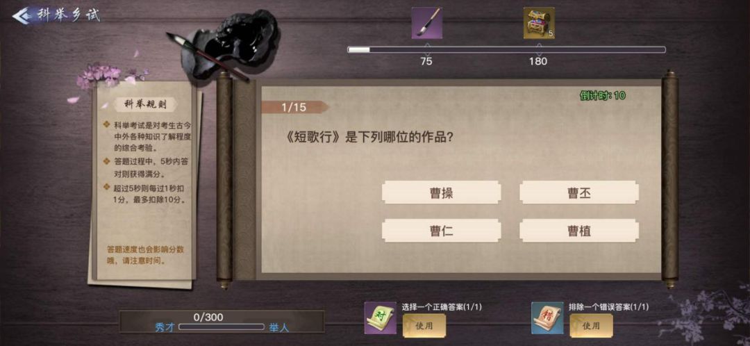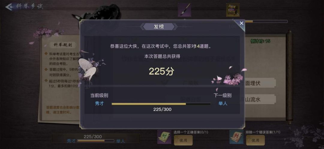游戏中的科举乡试玩法属于每日活动之一,每日可以参加一次,全天开放,任何时间段都可以参加。活动次数每日刷新,如果当日没有参加的话,次数会刷新掉,不过玩家可以在找回功能中使用绑银,找回部分奖励。既然是科举乡试活动,那么就和考试分不开,游戏中的科举乡试会随机出现选择题,玩家需要从4个答案中选择出正确的答案,题目的难度不算高。