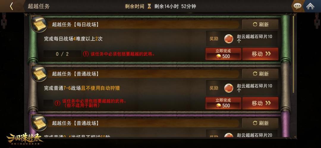 测试期间,“超越堂”内产出的“超越石”数量大大增加,主公们完成每周任务可获得的“进化石”数量也将加倍,可以更好地助力主公们的超强力武将快速超越,体验强力的超越技能,希望主公们可以充分利用手中的资源,合理搭配武将,实现一统天下的大业!