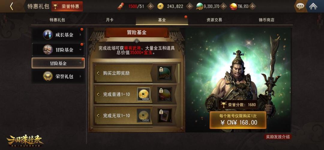 另外,“破阵”测试期间还有成长基金和冒险基金两种类型的基金福利可供主公自由选择。主公购买成长基金后可获得980宝玉,升满等级总计可领取11280金玉奖励,超12倍超值返还;主公们购买冒险基金后立得1680宝玉,完成主线战场可获得稀有金色武将自选券,大量金玉奖励和成长道具,总价值35000+宝玉,总计超22倍超值返利。