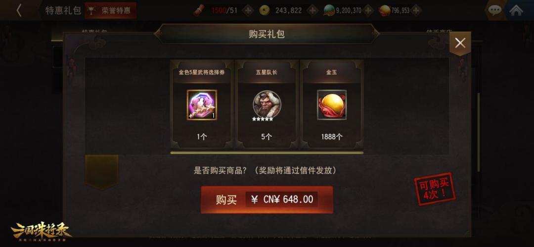 此外,主公们购买超值名将自选礼包后可以获得5星稀有金色武将自选券,主公们可自选任意金色稀有武将;购买3~4星武将抽卡特惠后还可进行10次武将抽取,武将抽取必出紫色或金色武将!