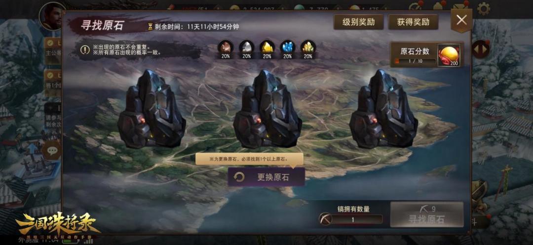 “寻找原石”主题活动:5月18日-5月25日17点,主公们完成主线关卡任务,就能获得道具“镐”,使用“镐”可以寻找收集不同品质的原石,原石可积累积分,主公们可以用积分换取大量金玉奖励。