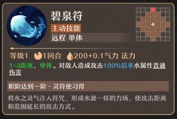 碧泉符(主动技能):1-3距离,单体。对敌人造成攻击100%倍率水属性普通伤害。