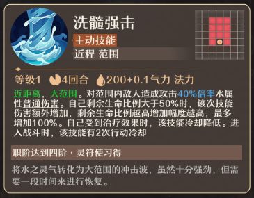 洗髓强击(主动技能):近距离,大范围。对范围内敌人造成攻击40%倍率水属性普通伤害。自己剩余生命比例大于50%时,该次技能伤害额外增加,剩余生命比例越高增加幅度越高,最多增加100%。自己受到治疗效果时,该技能冷却降低。进入战斗时,该技能有2次行动冷却。