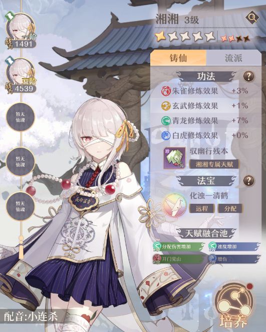 从角色属性上看,湘湘有着水系效果增强、符咒效果增强20%的效果,绝对是最佳人选。她的功法修炼效果天生对青龙、朱雀有着加成,角色成长事半功倍。专属天赋“驭幽行残本”简单粗暴,能够提升伤害技能效果。法宝“化浊—清鹤”也是一个大范围的伤害技能。融合天赋池中,除了天赋2增加移速外,其他均为伤害提升。尤其是法力值满时,能够额外提升爆伤,起手输出相当爆炸。