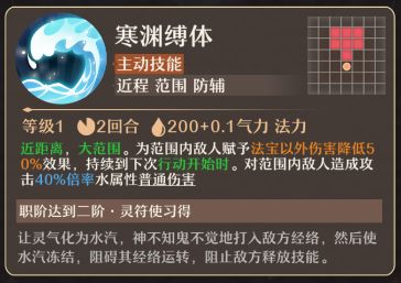 寒渊缚体(主动技能):近距离,大范围。为范围内敌人赋予法宝以外伤害降低50%效果,持续到下次行动开始时。对范围内敌人造成攻击40%倍率水属性普通伤害。
