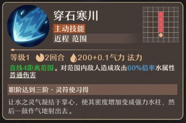 穿石寒川(主动技能):直线4距离范围。对范围内敌人造成攻击60%倍率水属性普通伤害。