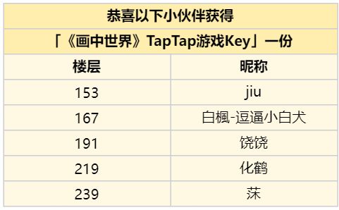 我们将按照规则通过生成随机数抽取5位小伙伴发放奖品【《画中世界》TapTap游戏Key】一份,若该楼层参与无效将往后顺延一层~