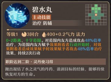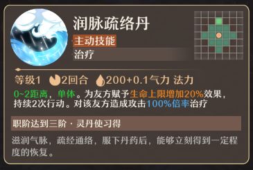 润脉疏络丹(主动技能):0-2距离,单体。为友方赋予生命上限增加20%效果,持续2次行动。对该友方造成攻击100%倍率治疗。
