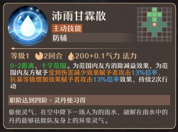 沛雨甘霖散(主动技能):0-2距离,十字范围。为范围内友方消除减益效果,为范围内友方赋予受到伤害减少效果赋予者攻击13%倍率,抗爆等级增加效果赋予者攻击13%倍率效果,持续次行动。