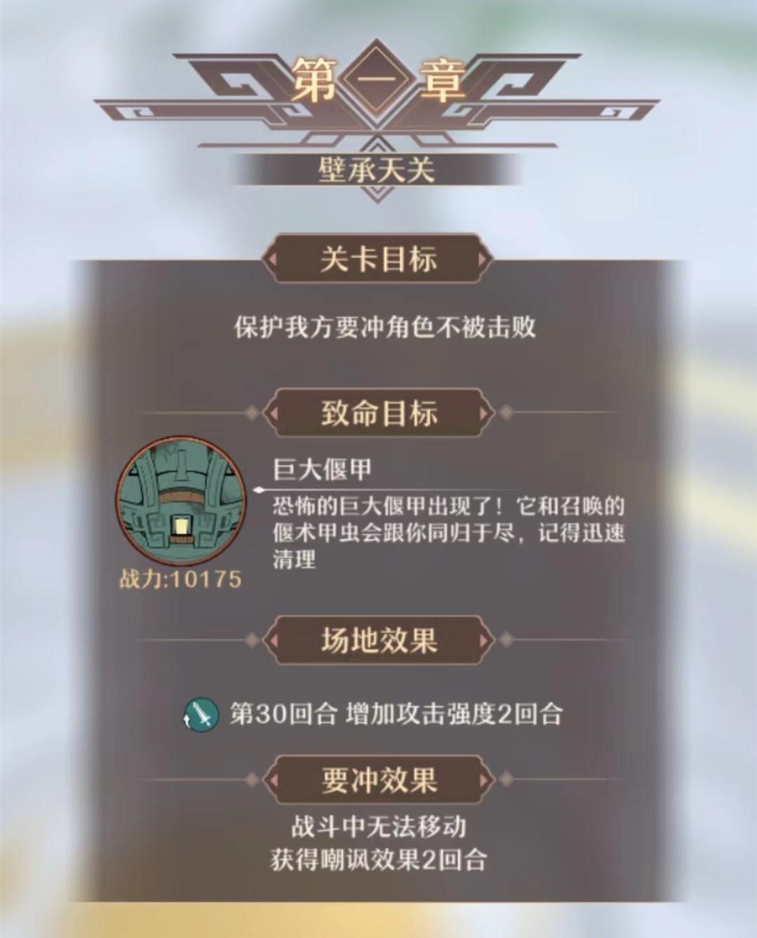 前面的攻略为大家介绍了如何战胜堕魔浊气使和偃甲柒号,而在战胜了堕魔浊气使和偃甲柒号后,将会遇到更加强大的巨大偃甲。本期攻略就带大家来了解一下,如何战胜巨大偃甲,对应主线关卡金乌篇1-24“壁承天关”。