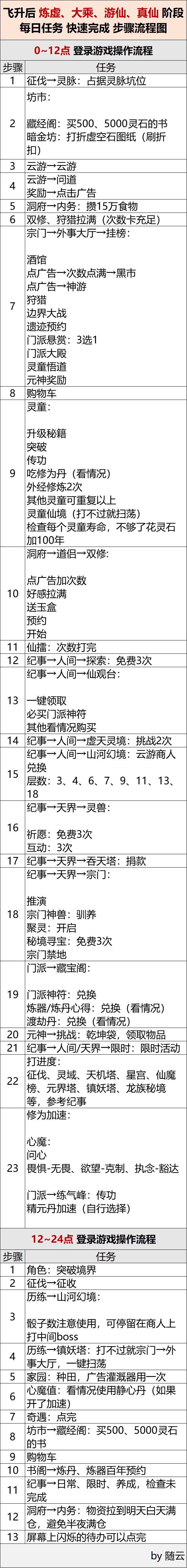 主要说一下以萌新的角度,从刚飞升后的炼虚、大乘、游仙、真仙阶段,每天需要做什么,而不是对着纪事还是一头雾水,希望能帮大家把日常任务顺序理一理,减少遗漏、节约时间、少踩坑。
