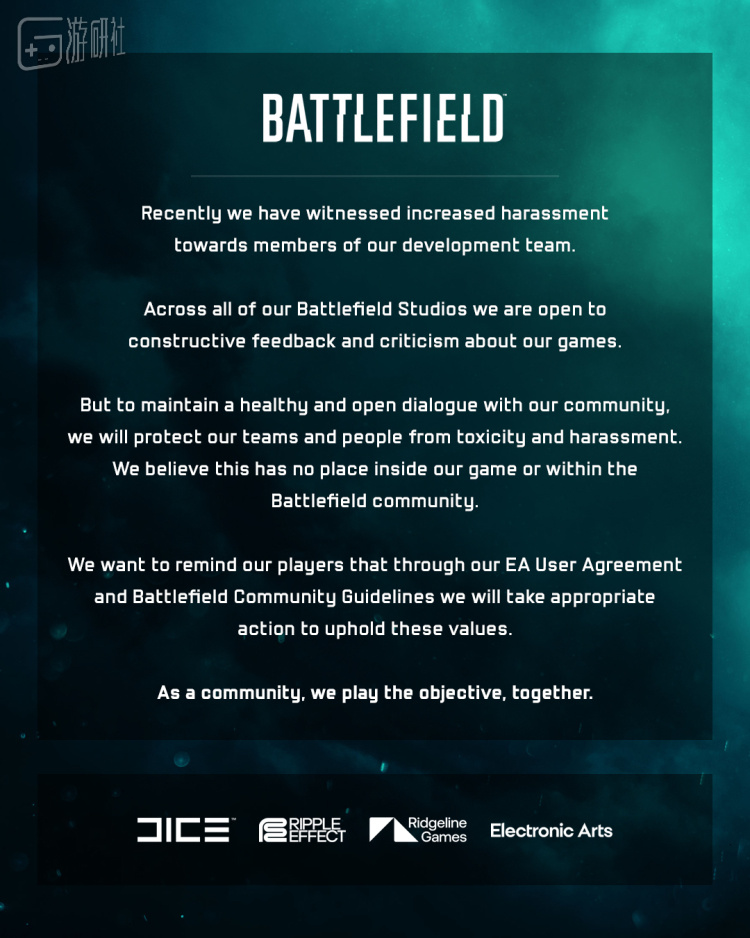 4.《战地》团队发布公告,称当前对开发人员的骚扰与日俱增。为了保护员工的安全,团队将会采取适当的保护措施。