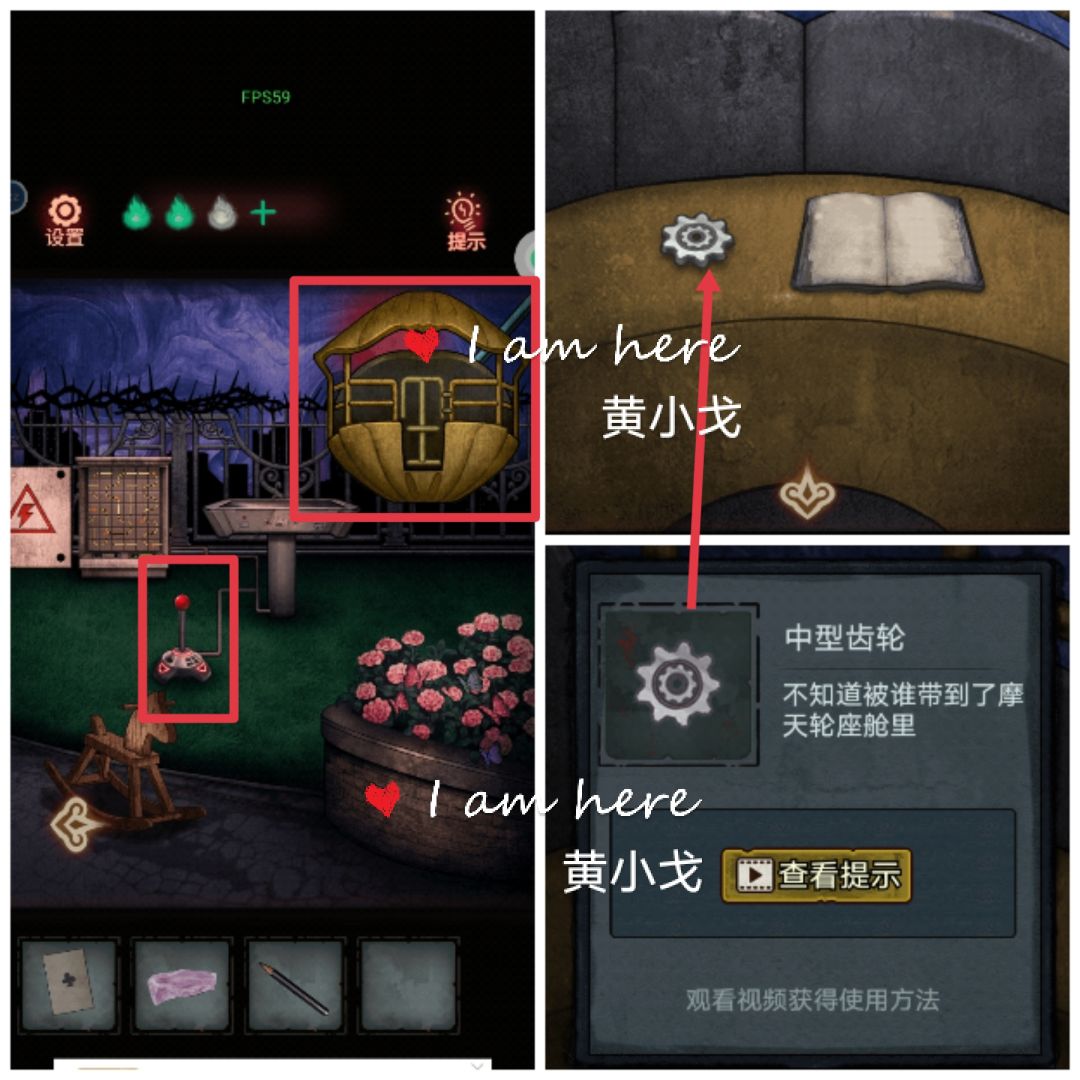 1.(游乐场-右边场景)点击操作杆,切换到摩天轮的黄色座舱,在座舱获得【中型齿轮】