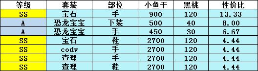 性价比的数值代表每100点小鱼干兑换N个黑桃(例如性价比3.2即是100鱼干换3.2黑桃)