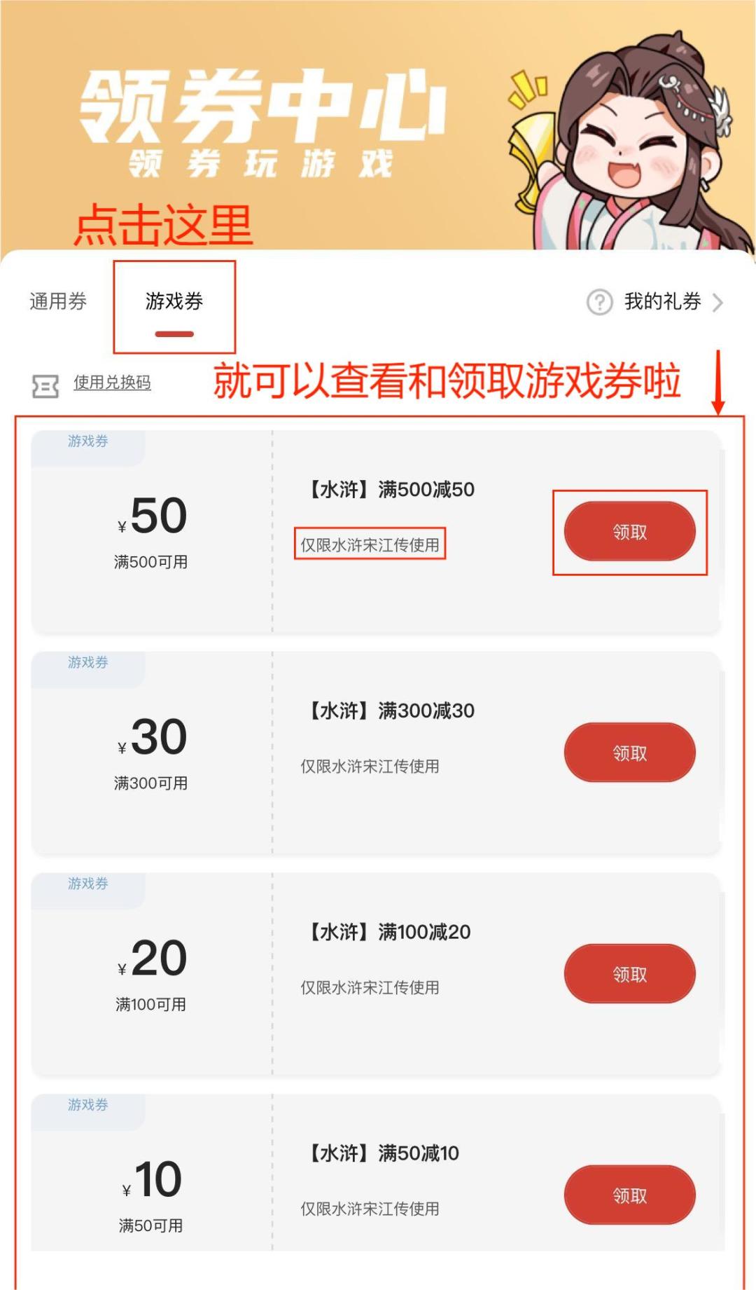 ②水浒专属满减券(500-50、300-30、100-20、50-10、10-4)