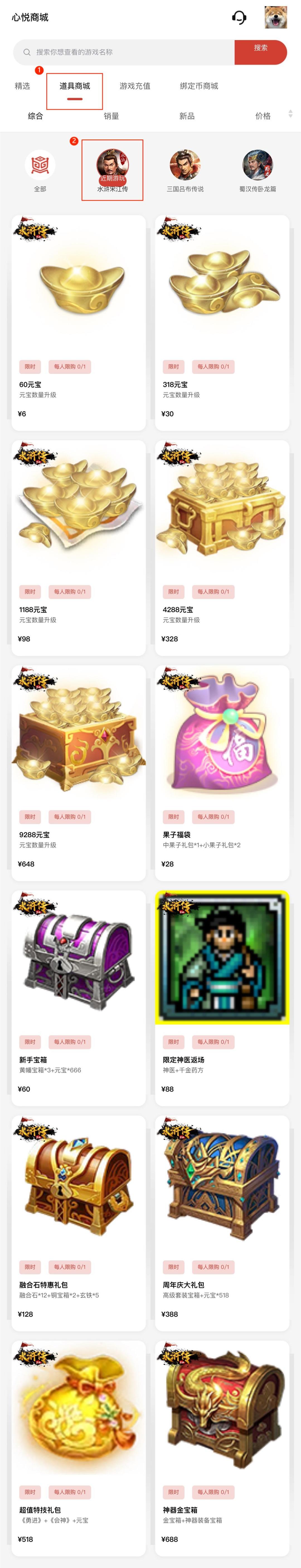 在心悦商城中-点击[道具商城]-选择[水浒宋江传],即可查看到以下内容