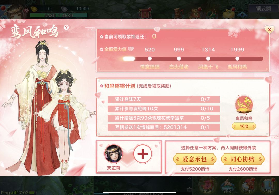5月19日-5月31日期间,少侠们在游戏内点击【鸾凤和鸣】按钮进入活动页面,然后与好友组成双人小队即可参与。