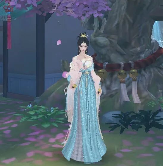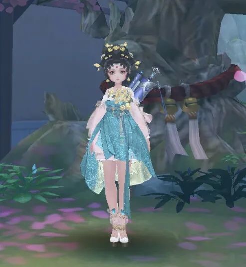 一袭盛装打扮明艳可爱,随行乐人奏响羌笛,少女于花灯池旁翩跹起舞,锦绣衣裳映衬无穷芙蓉,初见她国色天香之姿。