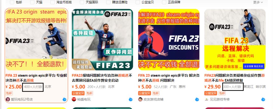 甚至,现在「帮玩家正常进游戏」都发展了一门产业,别看截图挂着最低5元聊着最低都是30起步。据我粗略统计,仅在淘宝一个平台就有至少2000人为了顺利进游戏而下单。