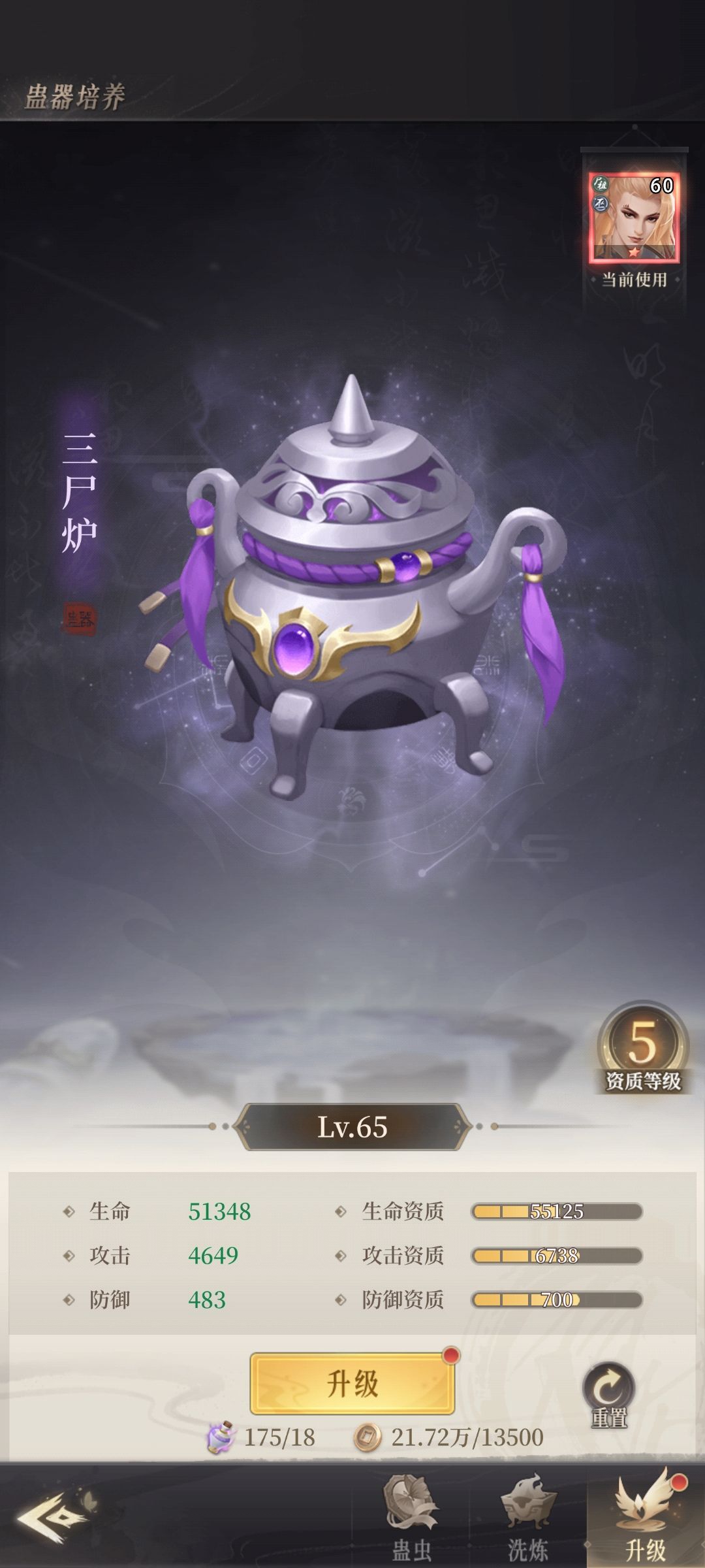 🔷蛊器:蛊器也是重要的战力来源,也是我特别推荐升的东西,蛊器可以提升到和你的角色账号相同等级,蛊器单级提升战力不高,我记得好像是100多战一级?但是他能升到和你角色账号一样的等级,且升级消费很少,真的很划算如我蛊器65级升到66级铜币只需要一万多。非常推荐大家升,当然优先装备其次蛊器。
