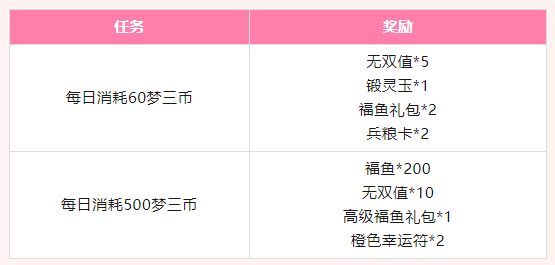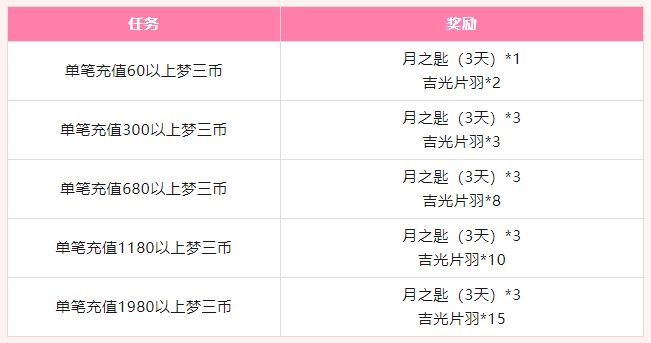 单笔充值梦三币,可以获得吉光片羽,可兑换封灵玉自选礼包!