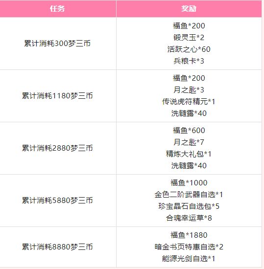 完成累计消耗任务,可以获得福鱼、金色二阶武器自选、珍宝晶石自选包等超值好礼~