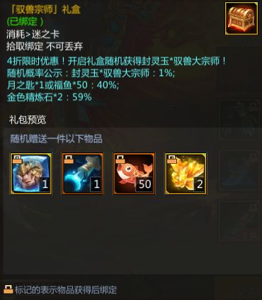 「驭兽宗师」礼盒,原价140梦三币,折后价39梦三币,无购买上限