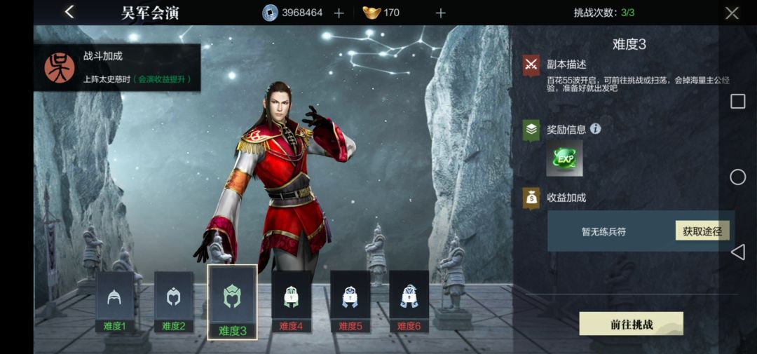 当通关完成后,便会出现免费扫荡的字样(在这用吴国会演做例子),这时候只需要动动手指,便可以收获经验,当然,不同难度的会演对应着不同程度的奖励,难度越高,奖励也越加丰富,想开启下一难度的会演,就需要参与百花,使得百花层数达到更高