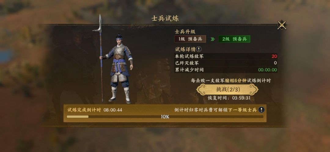 解锁士兵试炼任务后会有不同时长的倒计时,倒计时为0后解锁下一等级士兵,解锁后要在士兵试炼界面点击士兵升级哦 。倒计时期间您可以挑战击败敌军来大大缩短倒计时,试炼任务解锁后初始会有3次挑战机会,当您消耗了次数后,次数会随着时间恢复,恢复1次需要四个小时,且挑战次数最多存储3次。每一次挑战会有4轮敌军,每轮5支队伍,一共20支队伍,击败一支敌军可缩短6分钟,也就是完美完成一次挑战最多可缩短120分钟,完美完成3次挑战后可减少360分钟。