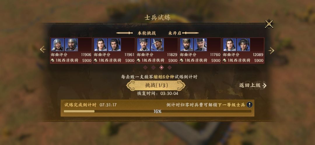 试炼任务等级越高,倒计时越长,比如2级士兵试炼任务,倒计时为9小时(540分钟),假设主公能完美完成3次挑战,也就是从开始解锁试炼任务后到解锁下一级士兵,极限只需花费(180分钟)3小时。其他更高等级的试炼任务等您来探索哦。每一轮的敌军会愈来愈强大,建议主公们做好万全准备,尽可能提升实力再来挑战哦。(比如培养武将,开启秘策,激活政令,升级科技等)