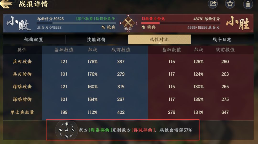 游戏内不同兵种存在克制关系,在对阵时克制方将获得攻击和防御加成。在对战中遵循以下克制关系:盾→弓→枪→骑→盾。盾克制弓被骑克制,弓克制枪被盾兵克制,枪克制骑被弓克制,骑克制盾被枪克制,战车不存在克制关系。在PVE实战中,您在追剿野怪时出征界面会有克制提示,非常便捷。而在PVP对战就需要您牢记克制关系拉。善用兵者,不以短击长,而以长击短,善用兵种克制进行战斗可获得巨大优势(您可以从右下图的战报图看到克制带来的部曲属性增益)。