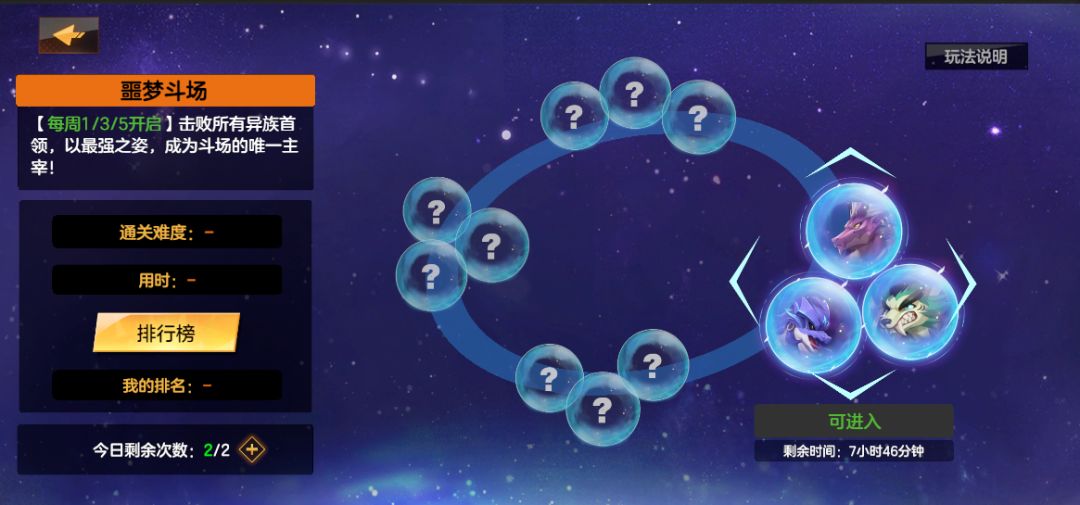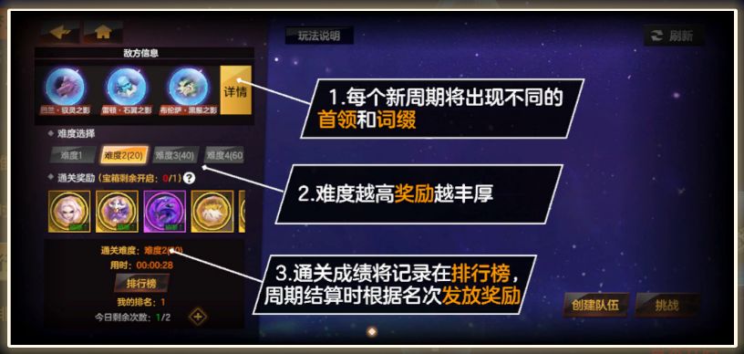 挑战有着不同的难度,每次挑战都将消耗相应次数,注意,即使你挑战失败,斗场也不会返还次数。在挑战前的准备时间,你会看见自己将要面对的首领,以及它们所在区域的加成(例如:降临后移动速度降低30%,攻击力提高100%),你可以通过调换首领所在区域改变他们的力量。