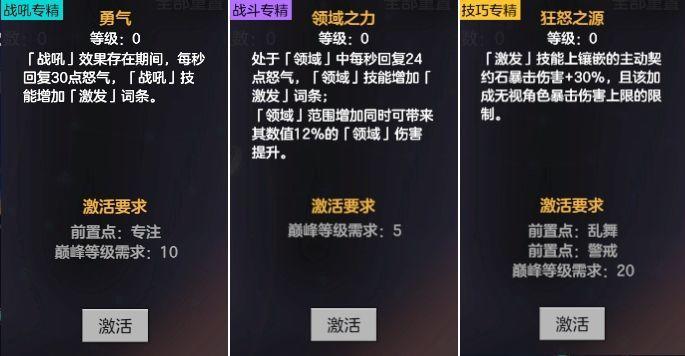 天赋的效果并不是单一的,我们有意将“怒气”增长消耗与额外技能效果融合在了一起,让你在点亮天赋时能同时激活两个效果,使得你有更多点数去选择其他天赋。