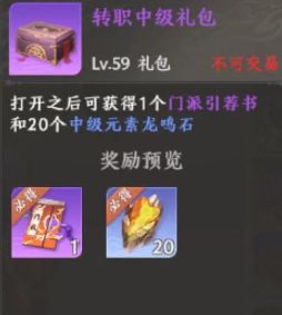 第一个,建议普通玩家跟小氪党无脑入手转职中级礼包就好了,商城里的门派引荐书是1200元宝,20个中级元素龙鸣石是800元宝,加一起要2000元宝,但这个中级礼包只需要1600元宝,能节省400元宝。