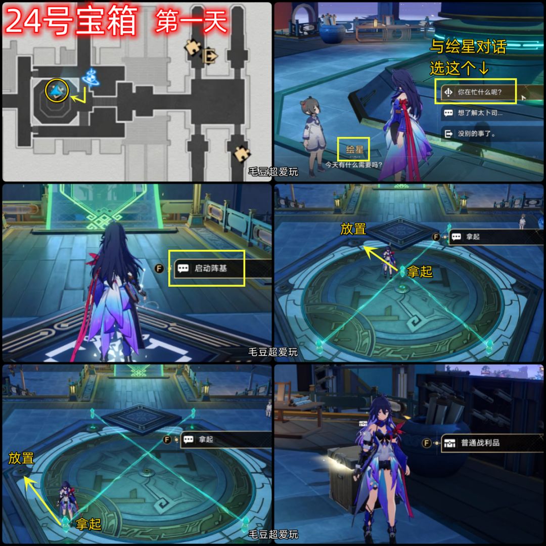 24号宝箱(阵基系列第一天):阵基系列解谜小提示:通过拿起、交换、放置更改图像解开谜题,趣味性较强,解谜的方法不唯一。持续3天,每天可通过挑战拿到两个宝箱,共计6个宝箱。传送到“授事厅”找“绘星”对话,这里选择下图的选项,开启阵基系列解谜,完成1轮解谜后拿到24号宝箱。