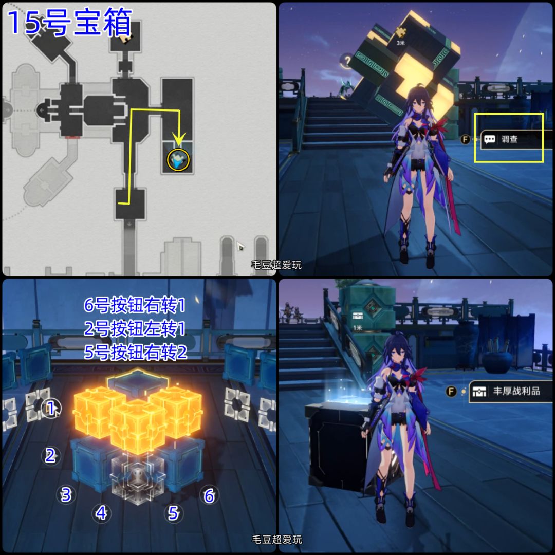 15号宝箱(魔方):顺着主路贴着右侧的墙壁前进,将15号的魔方解开,即可拿到宝箱。