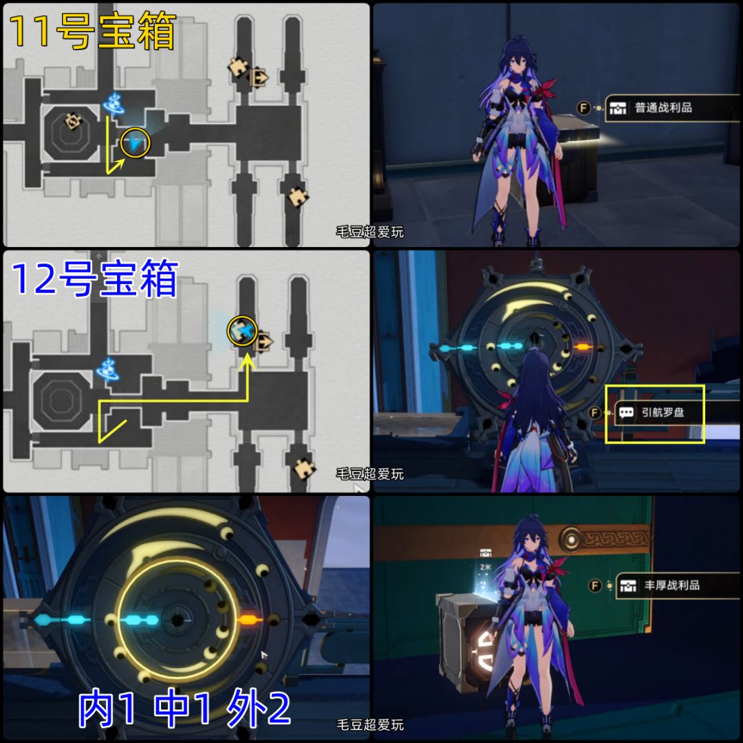11-12号宝箱(罗盘):再次回到“授事厅”,朝地图下方走一点,下楼拿到11号宝箱,然后朝地图右上方前进,12号宝箱是罗盘解谜。