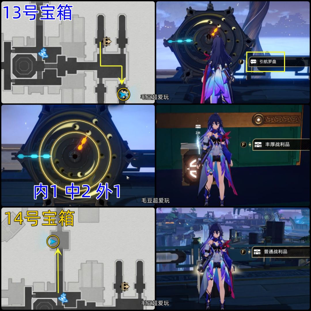 13(罗盘解谜)-14号宝箱:13号宝箱也是罗盘解谜,拿完再次回到“授事厅”,这次朝地图上方前进,在平台拿到14号宝箱。