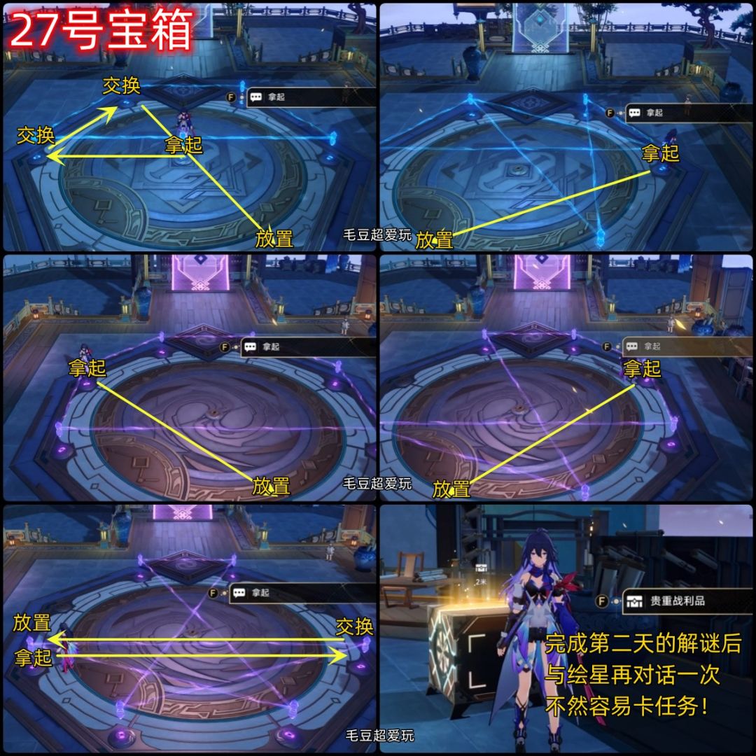 27号宝箱(阵基系列第二天):继续与绘星对话,完成两轮谜题后拿到27号宝箱,这里需要留意一点:最好完成第二天的解谜后再次与绘星对话,防止“卡任务”的情况出现。