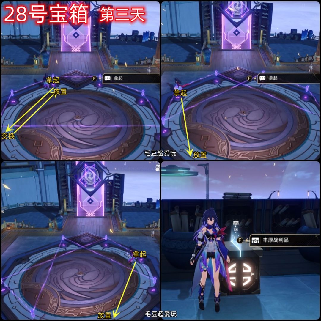28-29号宝箱(阵基系列第三天):这是第三天的解谜,还是和之前一样,第一个宝箱需要解开一个谜题,第二个宝箱需要解开两个图案的谜题,这样就能拿到两个宝箱啦!