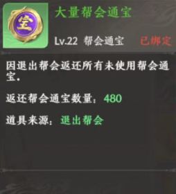 没想到刚退完帮会,背包里就多出来了大量帮会通宝这个东西,看来之前在帮会里的贡献都没白费,可以转移到下个帮会去,这个功能还真不错,得给策划点个赞,大伙以后也可以放心退帮了。