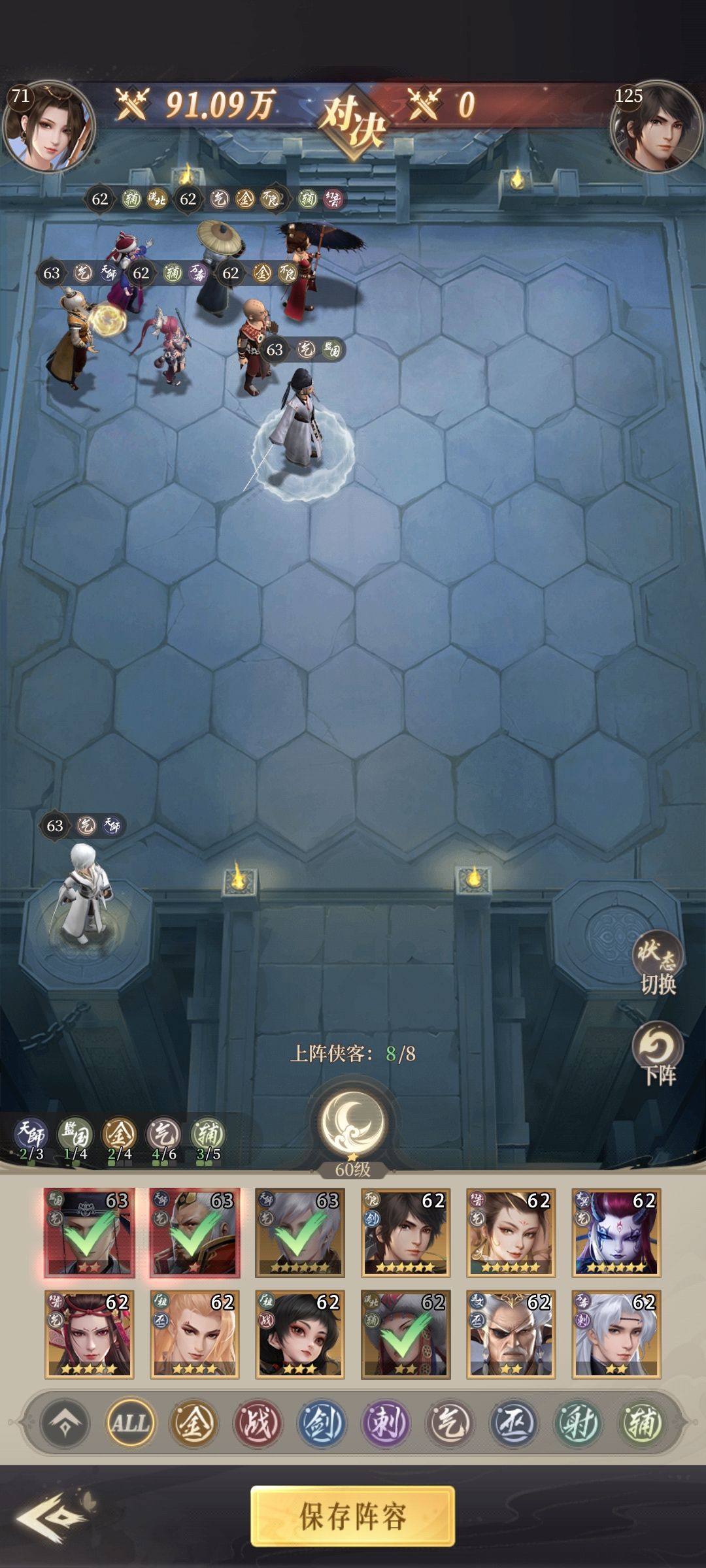 李存礼本身技能伤害高加上四气羁绊输出可以吊炸天,慧明选第二绝学能给身边队友套盾+回血很强势(带四阶法袍的套盾的装备)站老六边上。