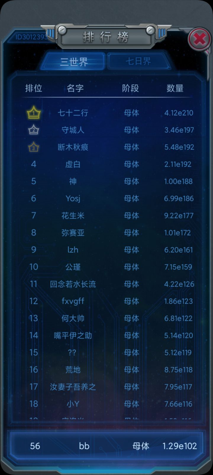 前天就到了母体了,然后今天攒了e103暗物质二炸了,十几分钟直接e一百多母体。总结下个人经验吧,其实大部分都是按照mobs大佬的速炸攻略来的。而且我甚至也没有严格执行,可能亏损了不少,总体就是e9暗物质一炸,然后一路到母体。值得一提的是一炸后到巨鳄这段时间会比较久,但是一旦到了巨鳄附近或者之后,就会有一个飞速暴涨的时期,基本上一两天可以直接达到母体。那段时期甚至来不及存电复制,一直扭曲来电升级就可以度过复制期,而且会出现主物种是n但是已经解锁n+3的情况,三级联动都没办法,反正看着点就完事了。后期甚至手点不过来。如果想快速到母体我就建议不要随便二炸了,一炸后度过大鲵之前的缓慢进步期后冲母体很快的。