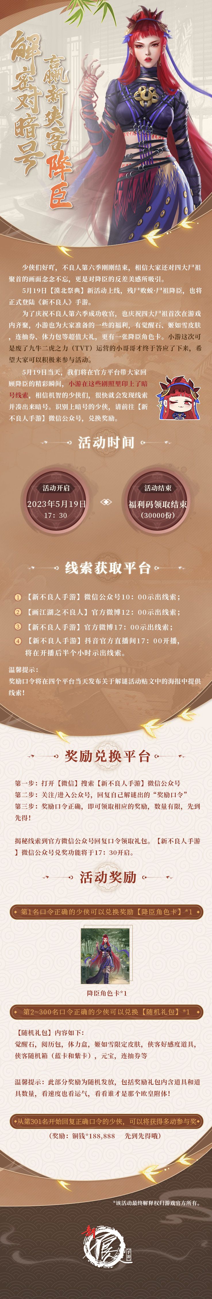 解开谜题,取得暗号的少侠可前往【新不良人手游】微信公众号,私信输入暗号,兑换奖励。