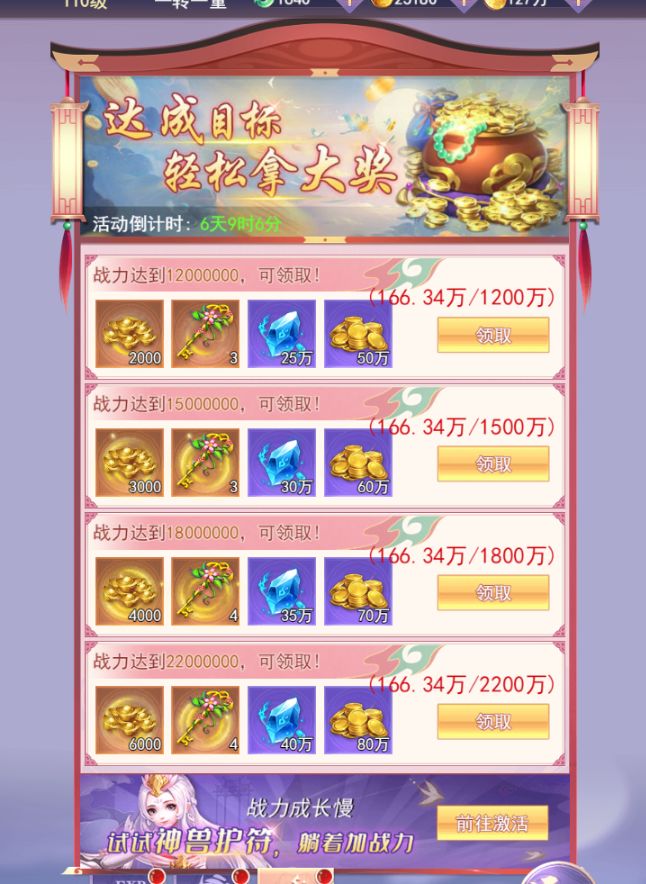 玩家从进入新服第一天开始,在活动期间内达到指定战力,即可领取对应档位礼包。