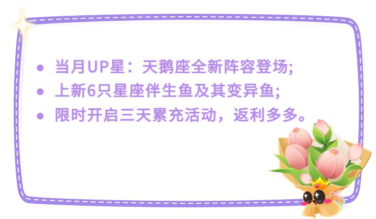 *可使用星愿珠转动星座光轮,即有机会获得星座鱼、星座伴生鱼。仙女座、大熊座、天鹅座现已加入时之星愿转盘!
